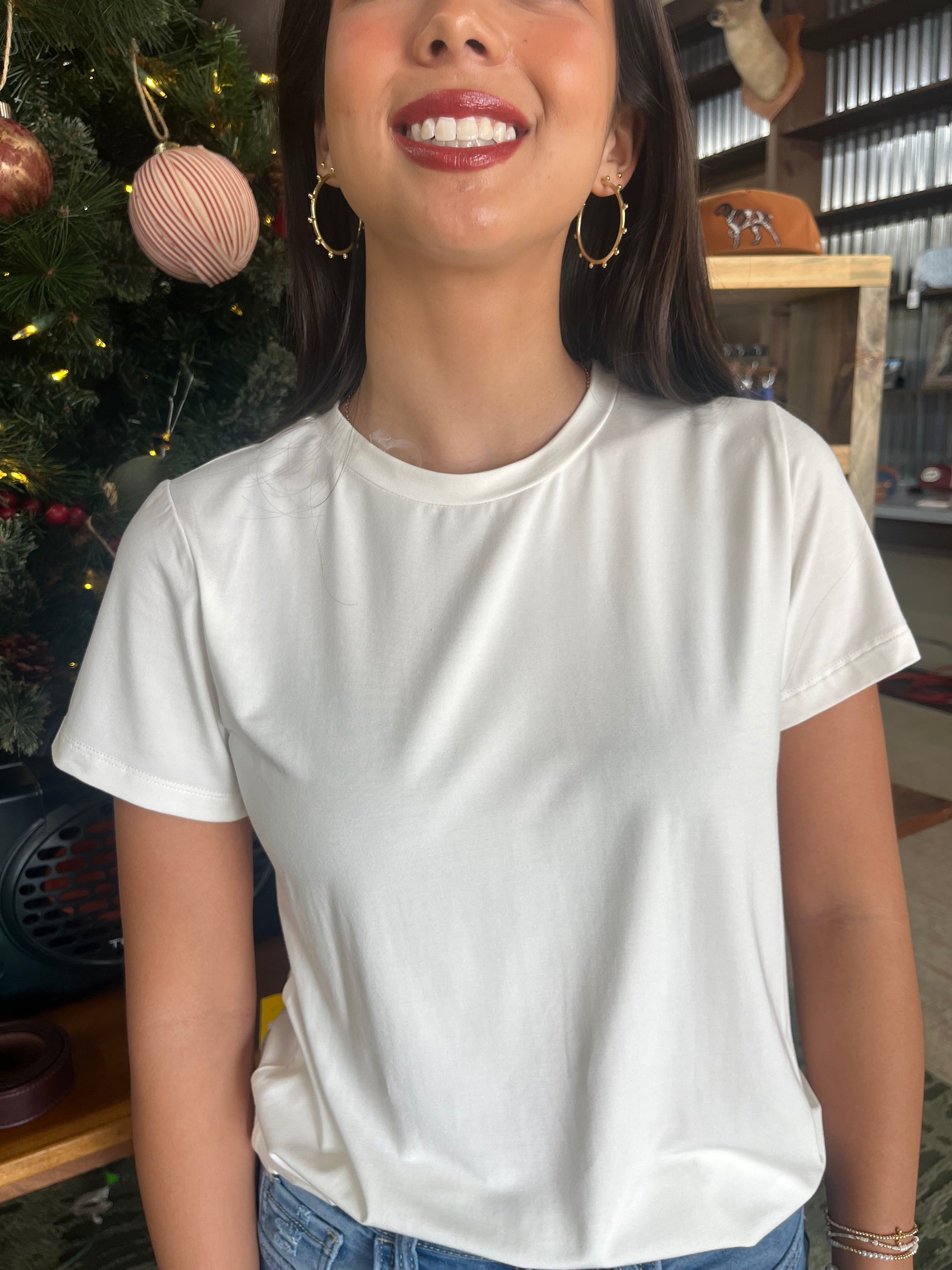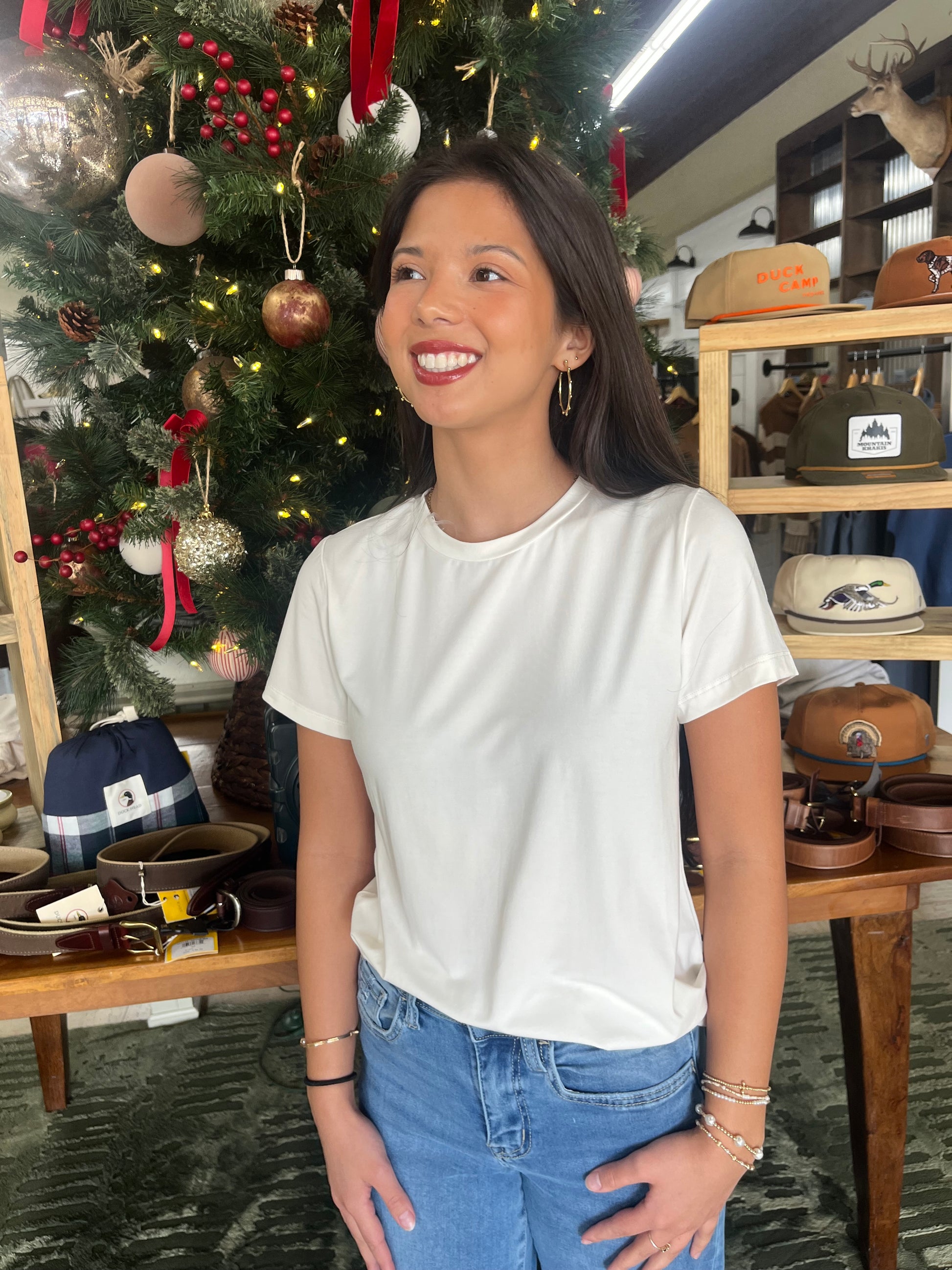 Simple never felt so luxurious. The Basic Tee in Off White is crafted from our signature bamboo/modal blend — buttery soft, eco-friendly, and lightweight. Its timeless silhouette and clean finish make it the perfect layering piece or standalone staple for effortless everyday style.