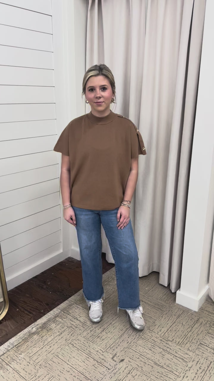 Elevate your everyday style with this chic short sleeve sweater. Featuring a modern mock neckline and unique button details at the shoulders, this relaxed-fit top blends comfort with polished sophistication. The soft knit fabric makes it perfect for transitioning between seasons, while the versatile camel hue pairs effortlessly with denim, trousers, or skirts. A must-have piece for layering or wearing solo, this sweater is the ideal mix of casual and refined.