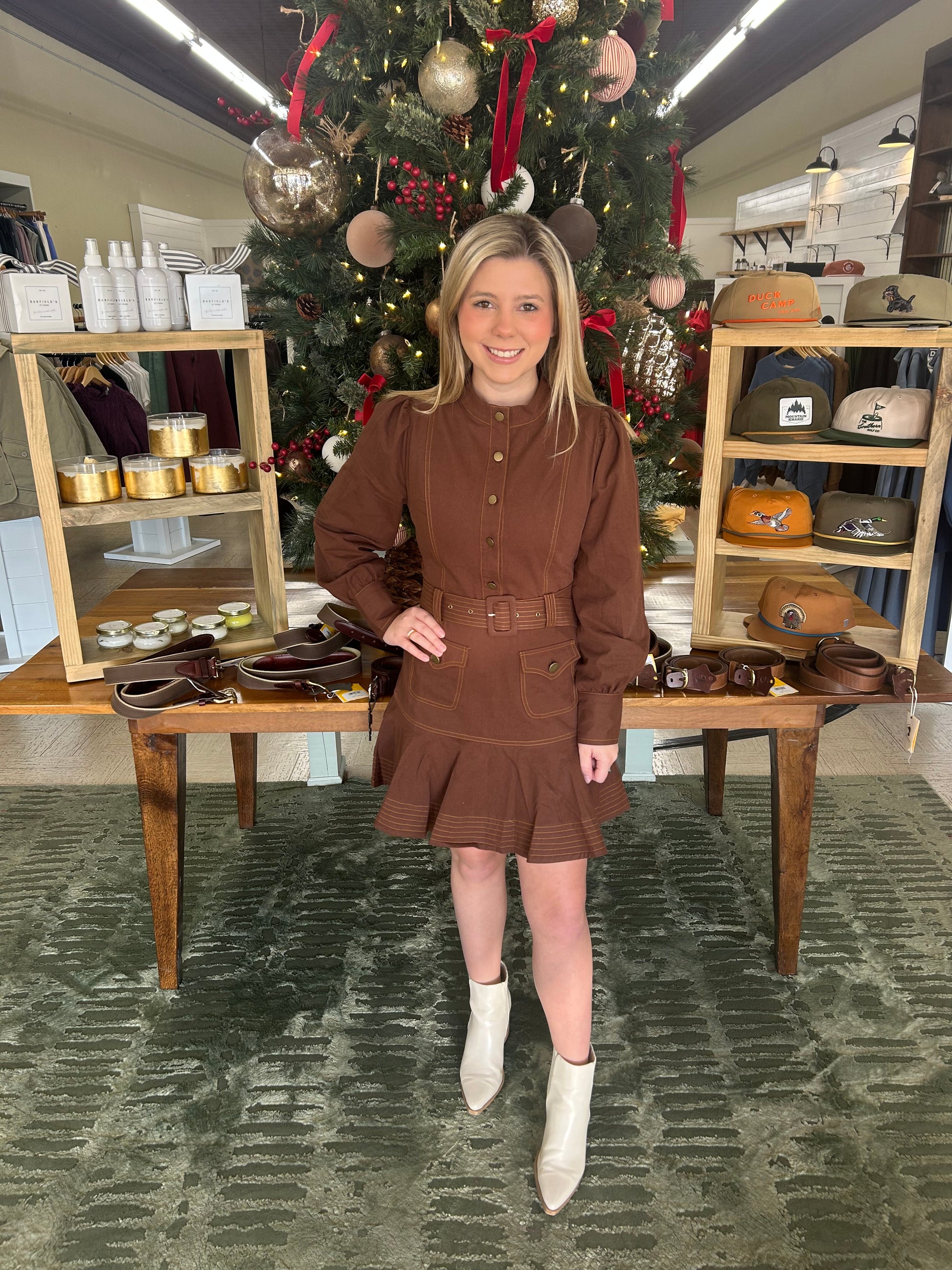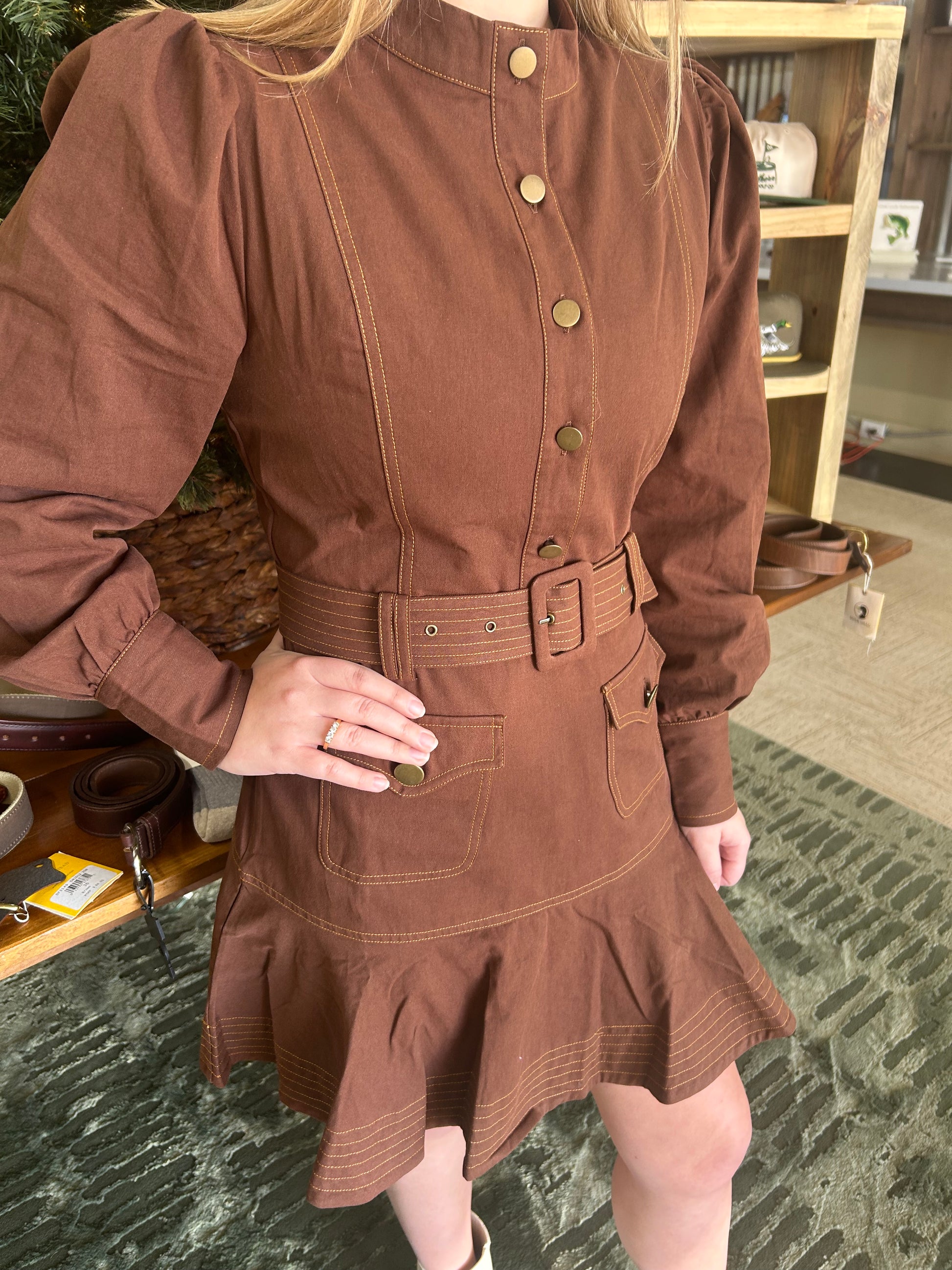 Chic, structured, and effortlessly polished, The Brixton Belted Mini Dress is a standout piece for fall. This rich cocoa-brown dress features a button-front bodice, puffed sleeves, and a tailored waist belt that creates a flattering, cinched silhouette. Functional utility-inspired pockets add a modern touch, while the soft ruffle hem brings a feminine finish.